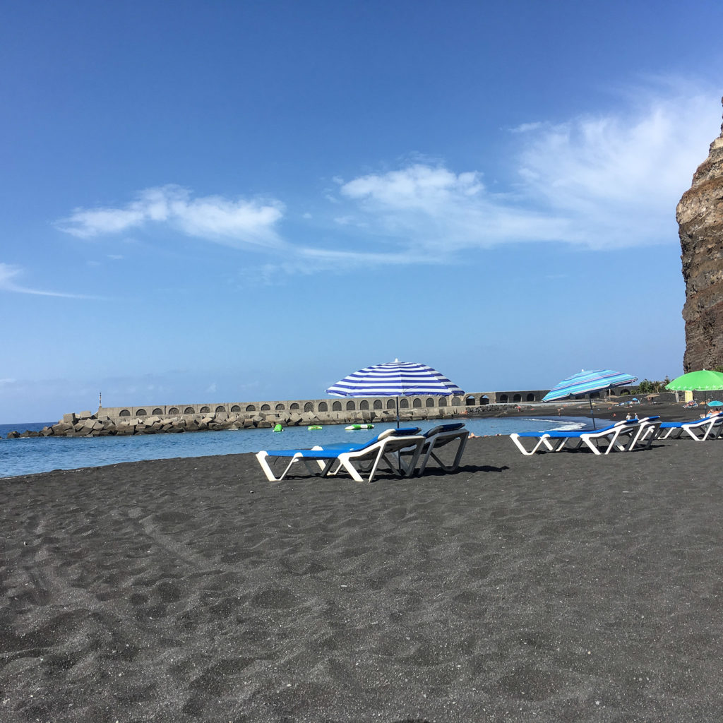 Natürlich kann man den Urlaub auf La Palma auch zum Baden nutzen. Aufgrund der vielen Steilküsten gibt es aber nur wenige öffentliche Strände. Sehr empfehlenswert ist der in der Nähe unserer Unterkunft befindliche Strand von Tazacorte . Er liegt sehr geschützt vor Wind und Wellen des Atlantiks und ist auf der Westseite der Insel meistens von der Sonne verwöhnt. Für ein paar Euro kann man Liegen und Sonnenschirme vor Ort leihen.