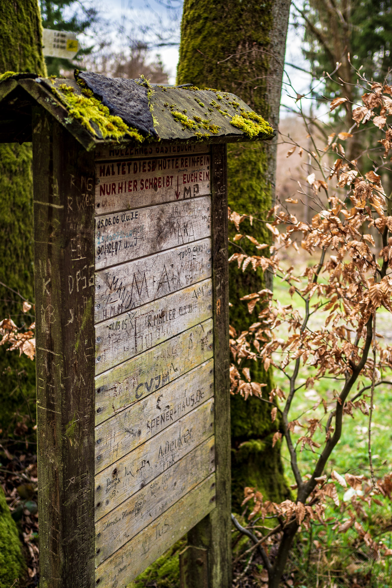 Direkt am Parkplatz führt der mit dem schwarzen Punkt markierte Wanderweg vorbei, dem wir von der Straße weg in Richtung des Ortsrandes von Bärstadt folgen. Vorbei am Feld und durch die alte Wochenendsiedlung geht es bald in den Wald.